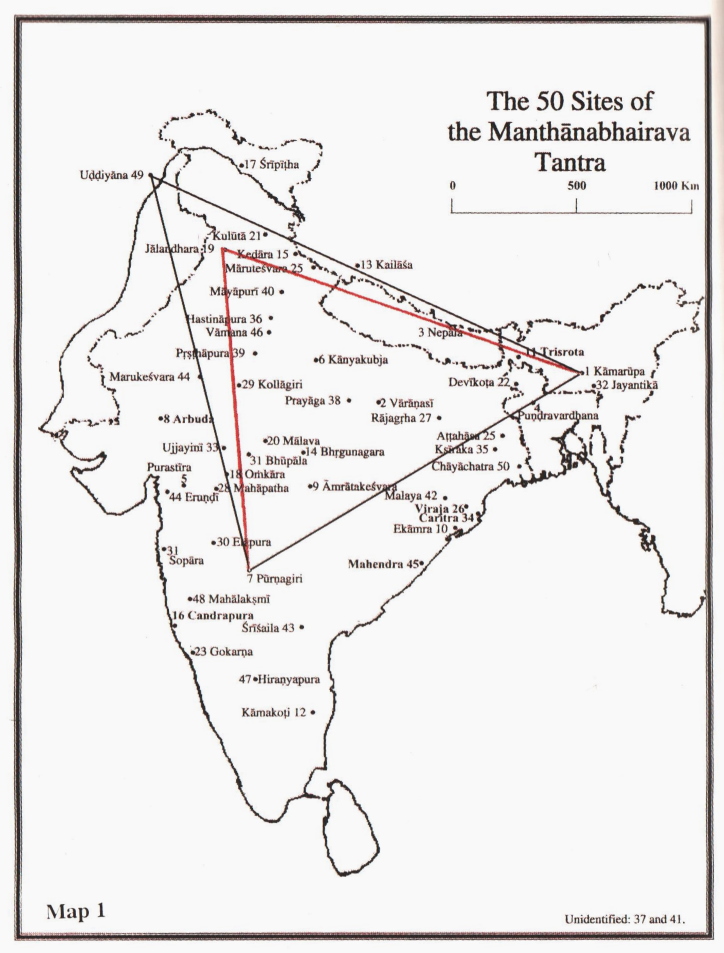 Boreas suggested a topic on trinities. That suits me well, because I've had a trinity in mind I've been meaning to ask about. It is the triangle of the four major shaktipithas. These are goddess related sacred places in India. The most important of these are Kamarupa, Uddiyana, Jalandhara and Purnagiri. These are actual locations in India and Pakistan, they are aspects of the esoteric anatomy and they are metaphysical principles.