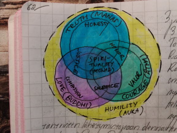 Since I am a lover of schematic systems that help and not hinder creativity, this multidimensional system of virtues really electrifies me. It presents the three basic virtues of Truth (compare to manas and truthfulness), Love (compare to buddhi) and Courage (compare to âtma and personal effort), and from their unions deduces three combined virtues of Justice (Truth & Love), Sacrifice (Love & Courage), and Honour (Courage & Truth). The three virtues together stand for Spirituality, whose seeming opposite but actual composite virtue is (tantric) Humility.